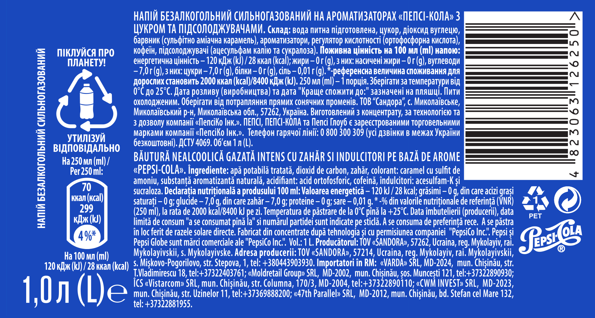 Alcohol-free strongly sparkling drink on natural flavours "Pepsi-cola" 1 L TM "Pepsi"
