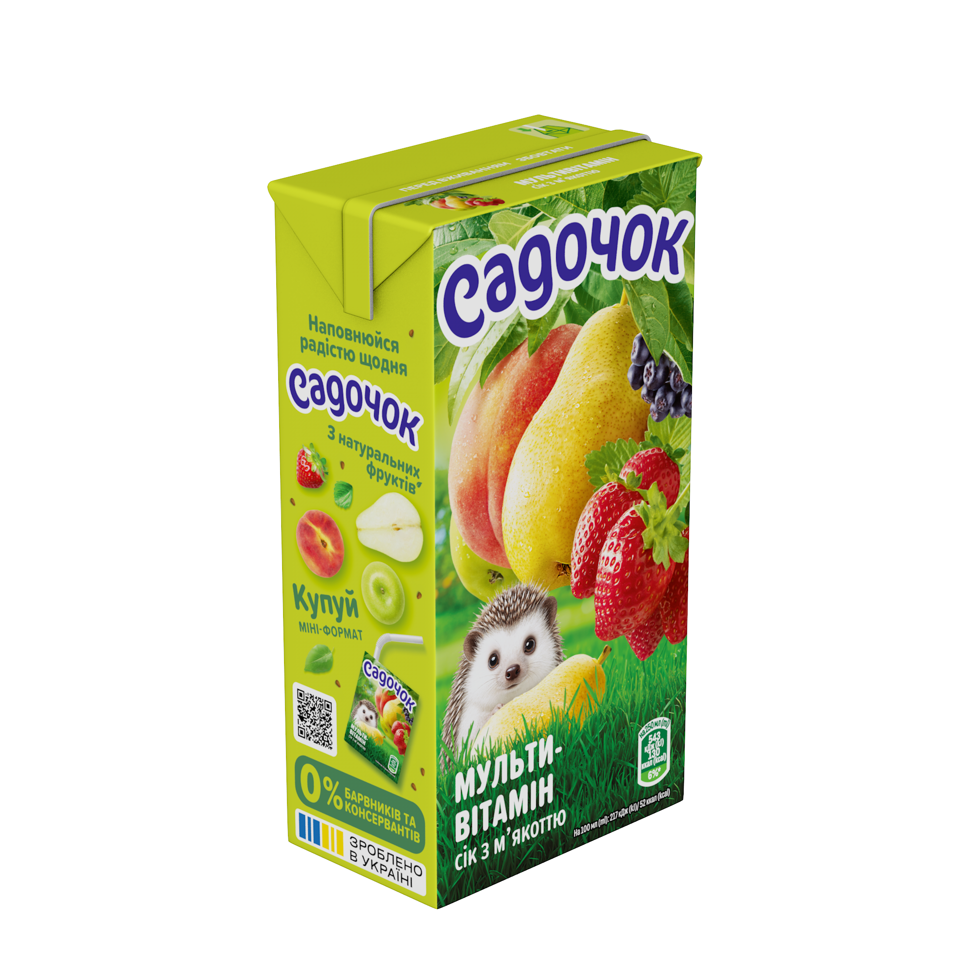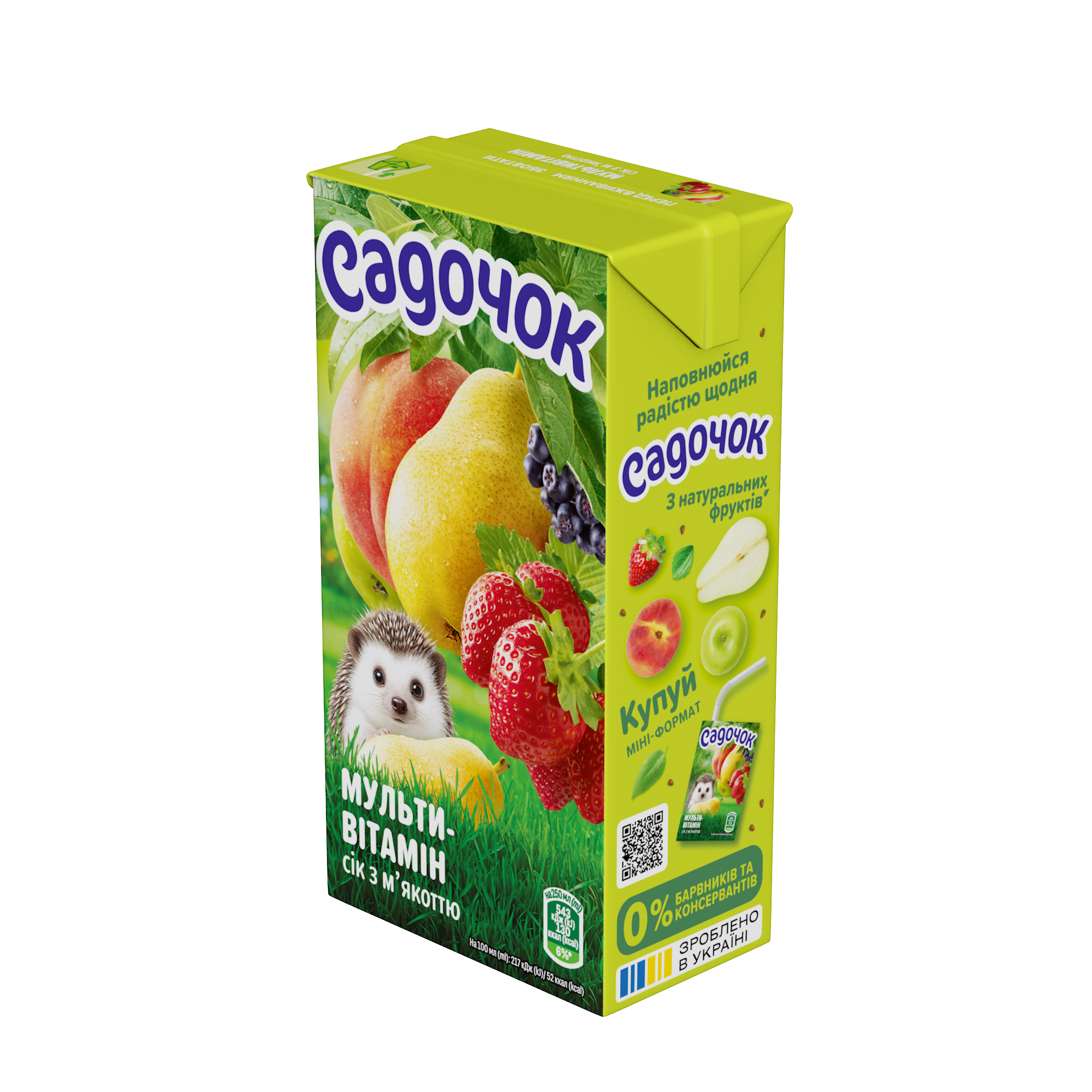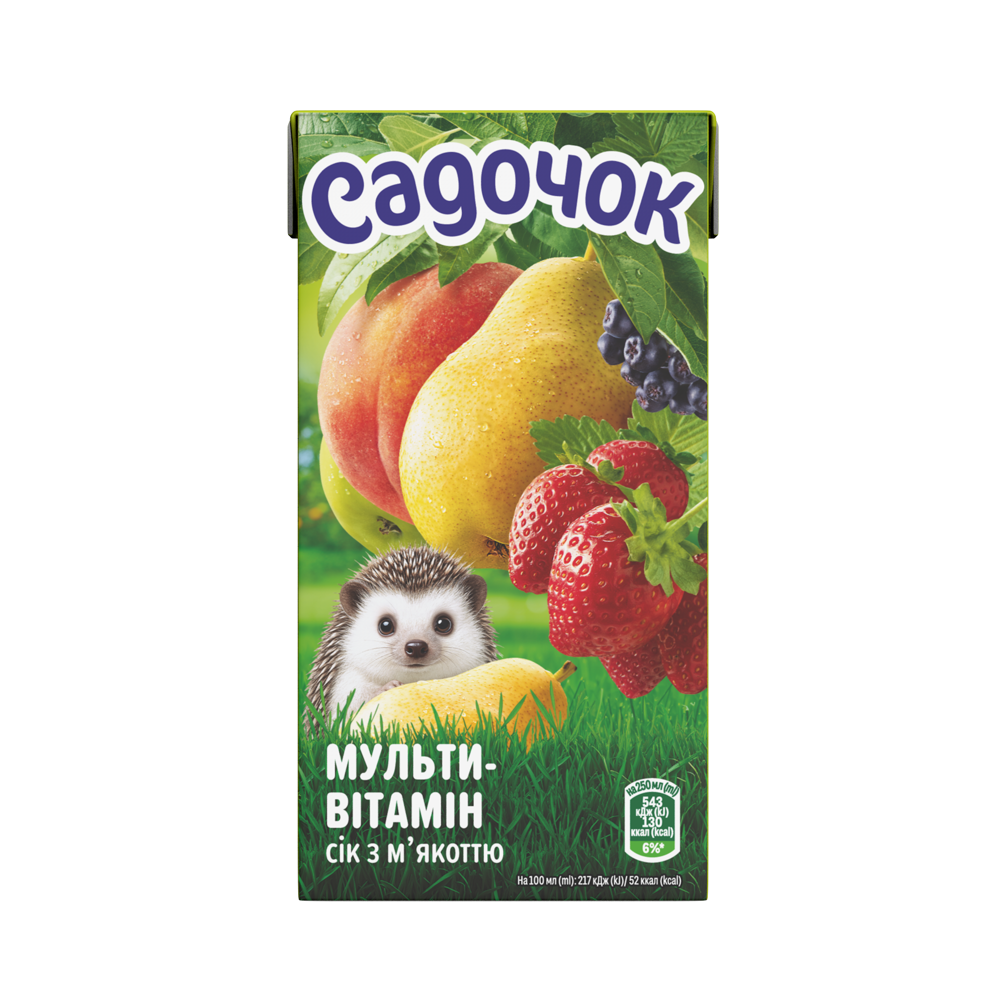 Мультивітамінний сік з м’якоттю від Садочока – це поєднання знайомих з дитинства фруктів та ягід з вашого саду в одній склянці. Це улюблений сік дітей і всієї родини на сімейному столі, що дарує свіжість соковитих яблук, стиглих груш, ніжних персиків та ароматної полуниці. Насолоджуйтесь смаком і піклуйтесь про своїх рідних разом з Садочок.